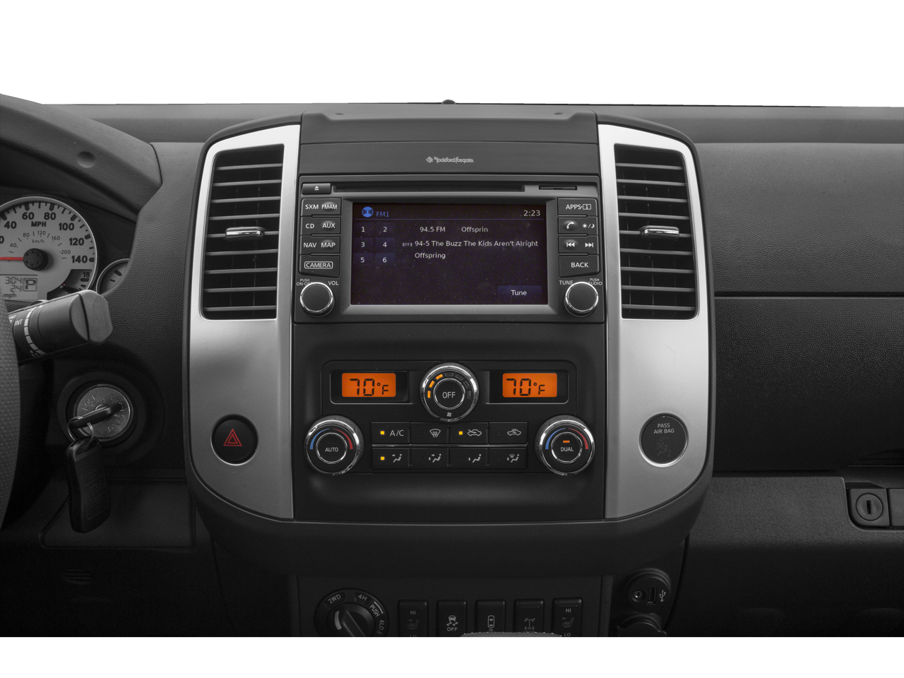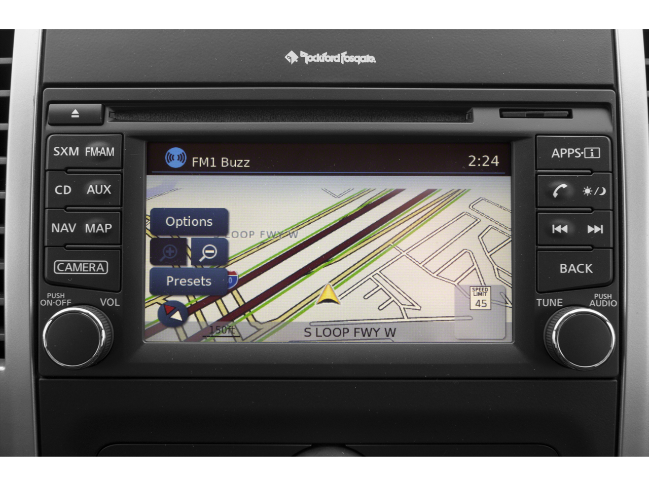 - Radio: Rockford Fosgate Premium Audio System -inc: AM/FM/CD/AUX, USB connection port, Bluetooth hands-free phone system, streaming audio via Bluetooth, Siri Eyes Free, steering wheel audio controls, 8 speakers w/1 subwoofer unit (2 speakers), NissanConnect w/navigation and mobile apps, Nissan Navigation System w/voice guidance, 5.8" color touch-screen display, Nissan voice recognition for navigation and audio, SiriusXM Traffic, SiriusXM Travel Link (fuel prices, weather, movie listings, stock info and sports) and SiriusXM satellite radio